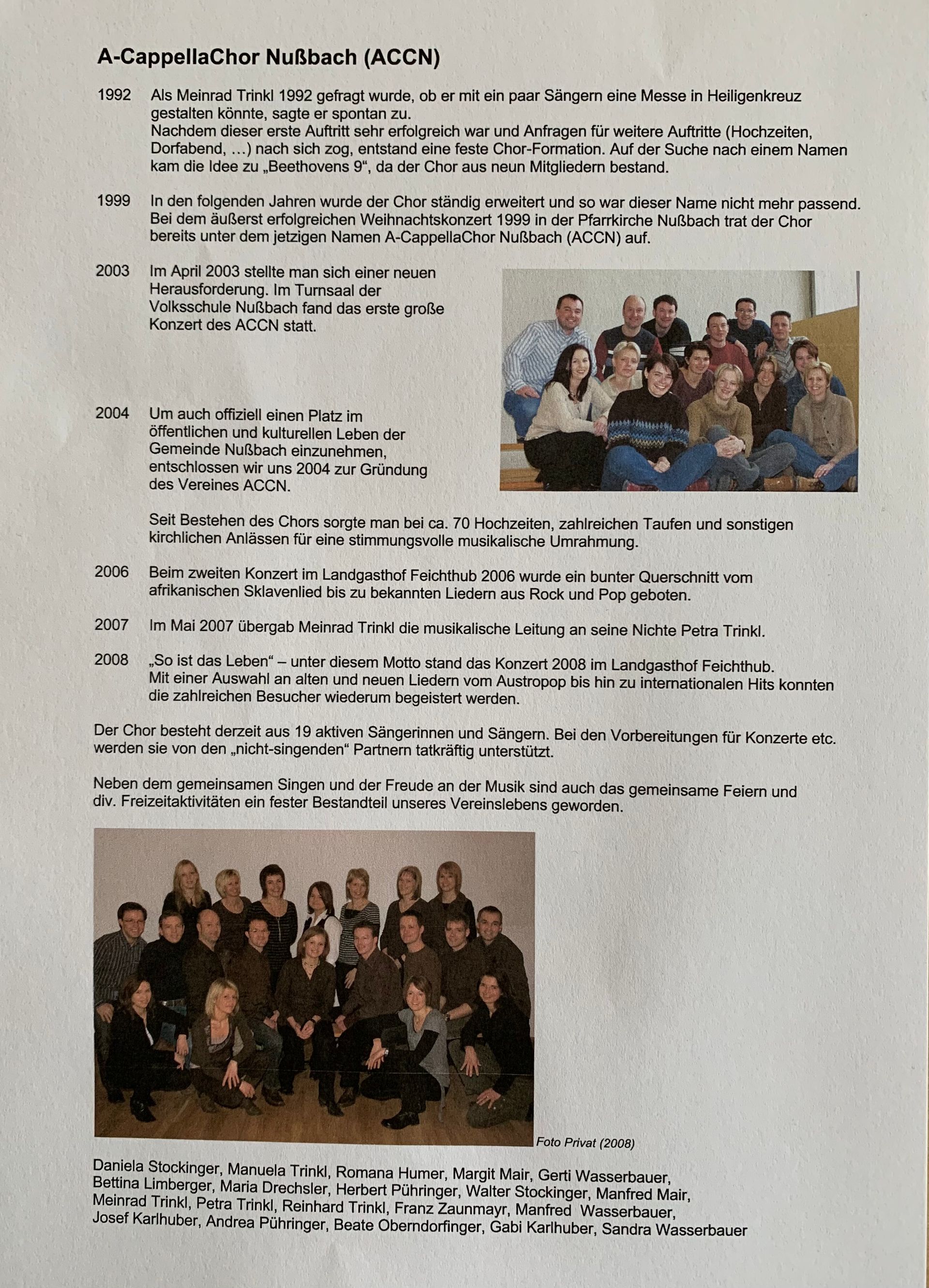seit über 30 Jahren treffen sich "SINGBEGEISTERTE" aus Nußbach und Umgebung zu regelmäßigen Proben und Auftritten...neben den unten angeführten Konzerten wurden eine Vielzahl an Hochzeiten, Taufen und Messen mitgestaltet.